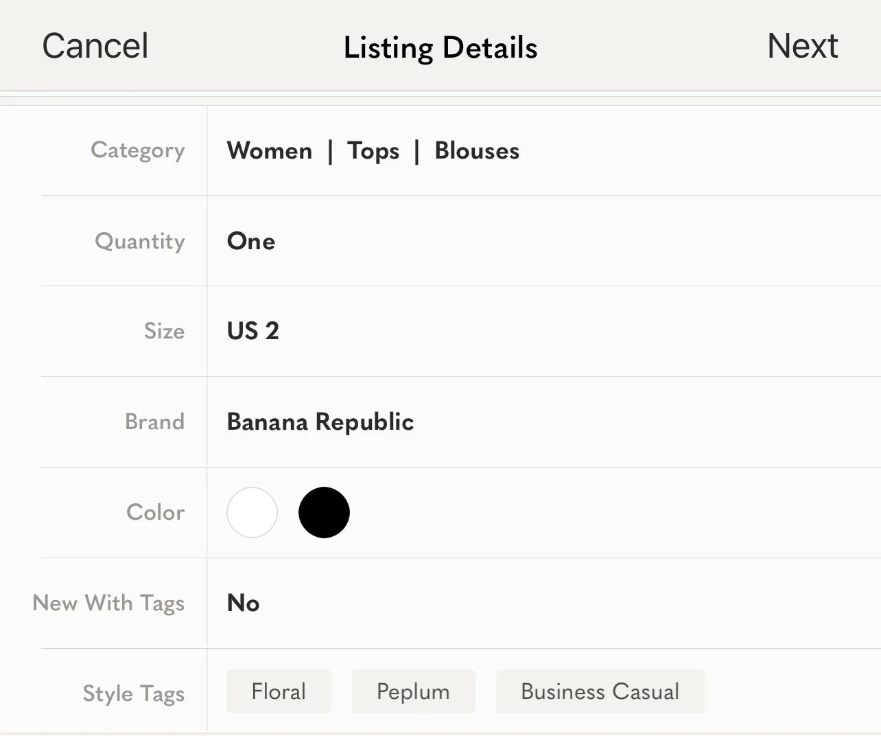 To facilitate filtering in their app, Poshmark makes you select certain details about the item you are listing, like the brand and the size. Always include all of the information, even if optional, to help buyers find your item.