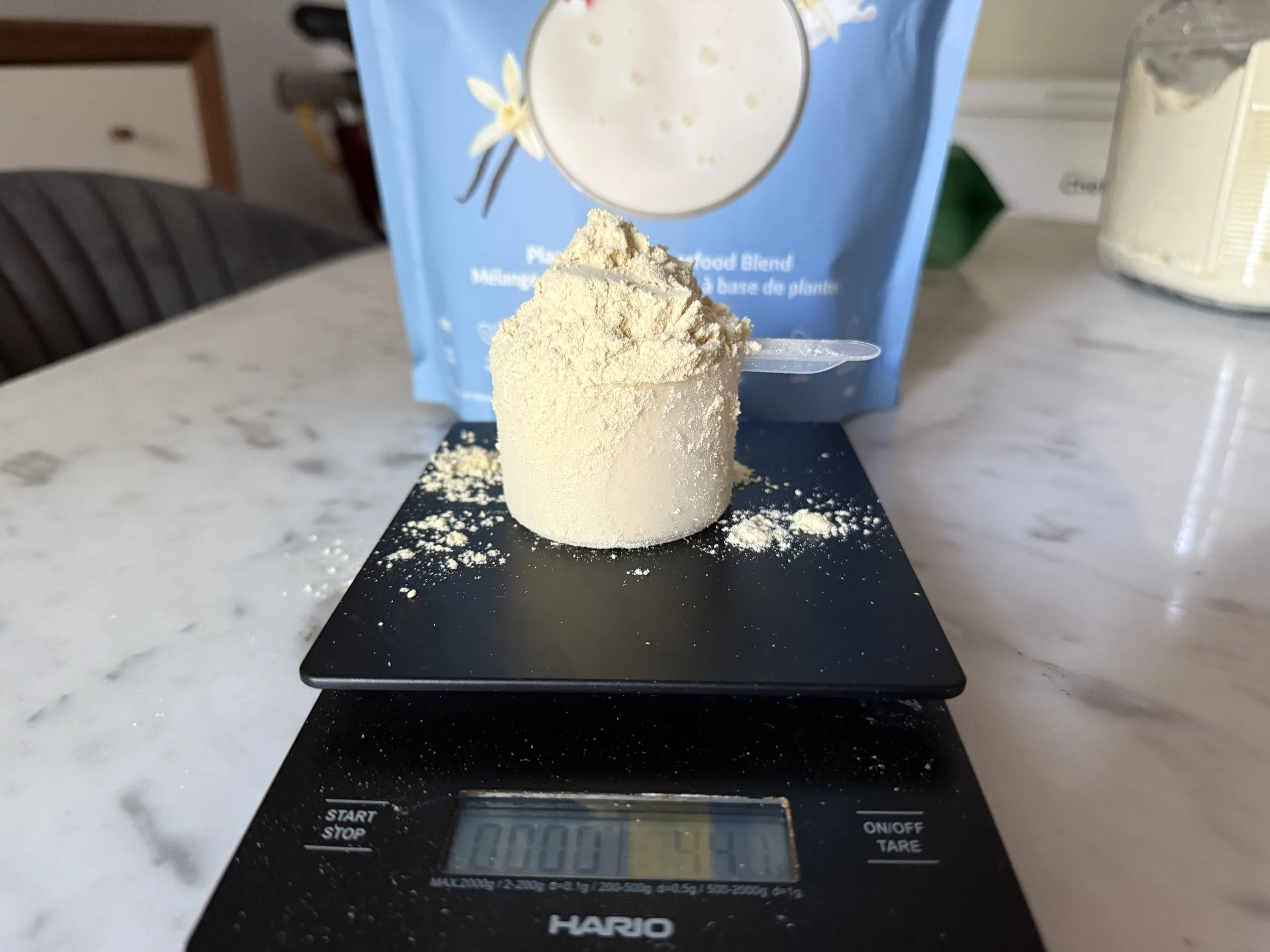 This may seem trivial to some, but it’s something I’ve found a bit annoying. Each bag of protein powder comes with a scoop, but the Nutritional Information panel lists the serving size as “1 rounded scoop (44g).” I happen to have a kitchen scale, and when I weighed what a “rounded scoop” actually meant, I realized I had been getting less than a full serving in each of my shakes!
