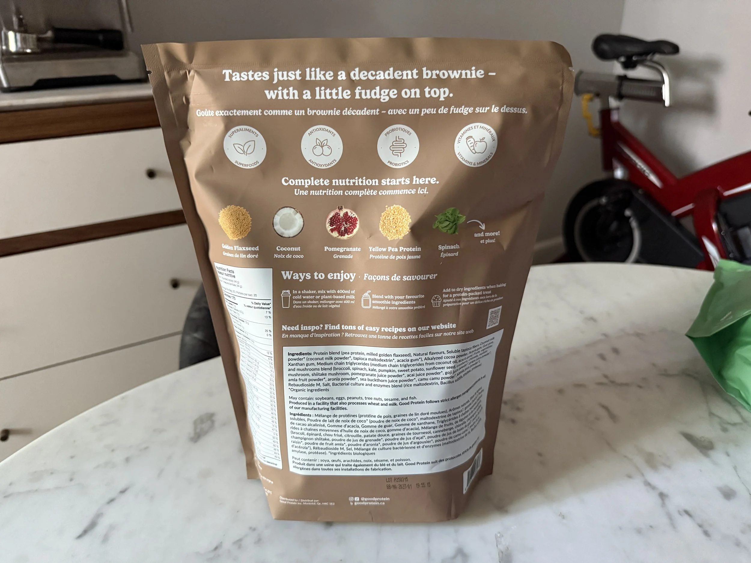 I’ve been on the hunt for a great-tasting vegan protein powder for years. As someone who exercises regularly and follows a mostly plant-based diet, getting enough protein is crucial and having a protein powder I can rely on is super important for me. I’ve tried so many vegan protein powders over the years—some chalky, some gritty, and some so full of artificial sweetener I had to rinse my mouth after. I also really wanted to buy something more local. My old favourite was made in the US, but with tariffs and shipping costs, it started to feel impractical. When I found out Good Protein was not just Canadian but actually based in Montreal (like me!) I figured it was worth a try.
